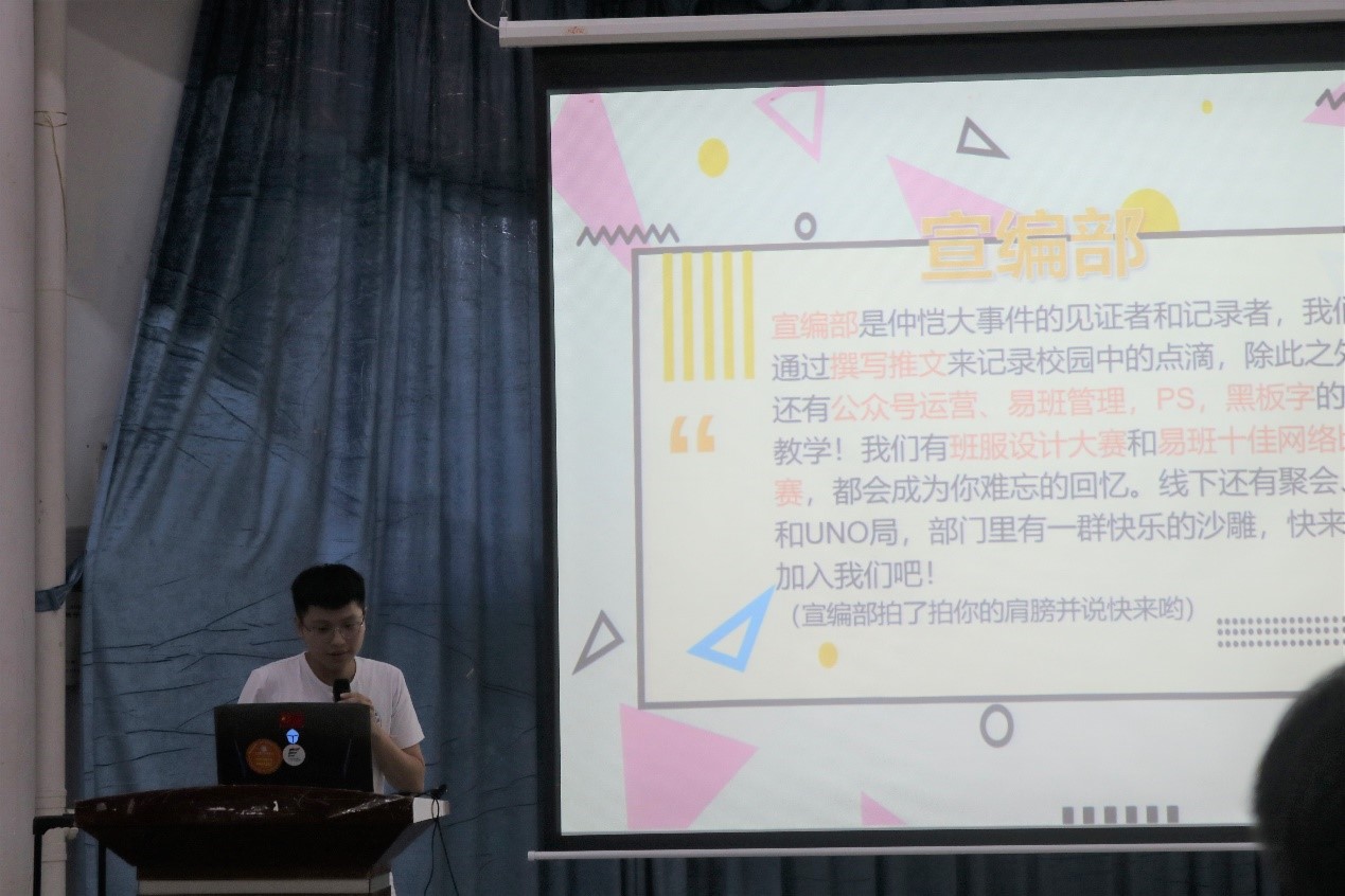 随着嘉宾和20级新生们共同观看了8858cc永利三大机构的宣传视频后,团委第一副书记李伟健、学生会执行主席汤镇源和新闻中心主任黄炜岚一一发言,他们以幽默的语言,生动的讲述了各部门的职能,让新生们进一步地了解各机构所属部门,以便新生在之后部门招新做出自己心仪的选择。